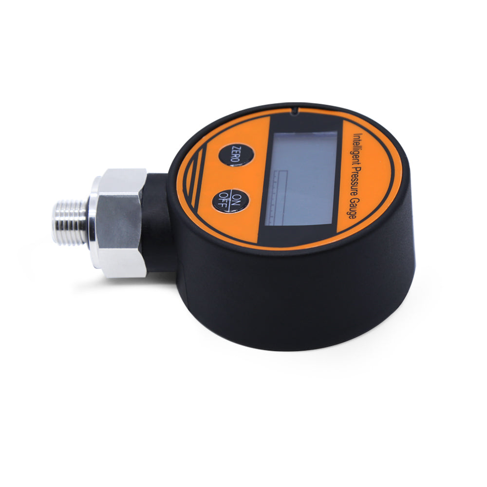 The digital pressure gauge is a fully electronic structure, battery powered and easy to install on site. The output signal is amplified and processed by a high precision, low temperature drift amplifier and fed into a high precision A/D converter, which is converted into a digital signal that can be processed by a microprocessor, and the actual pressure value is displayed by an LCD display after arithmetic processing.The intelligent digital display pressure gauge is flexible in use, simple in operation, easy to debug, safe and reliable. Widely used in water and electricity, water, petroleum, chemical, machinery, hydraulic and other industries, the fluid medium pressure measurement display.
